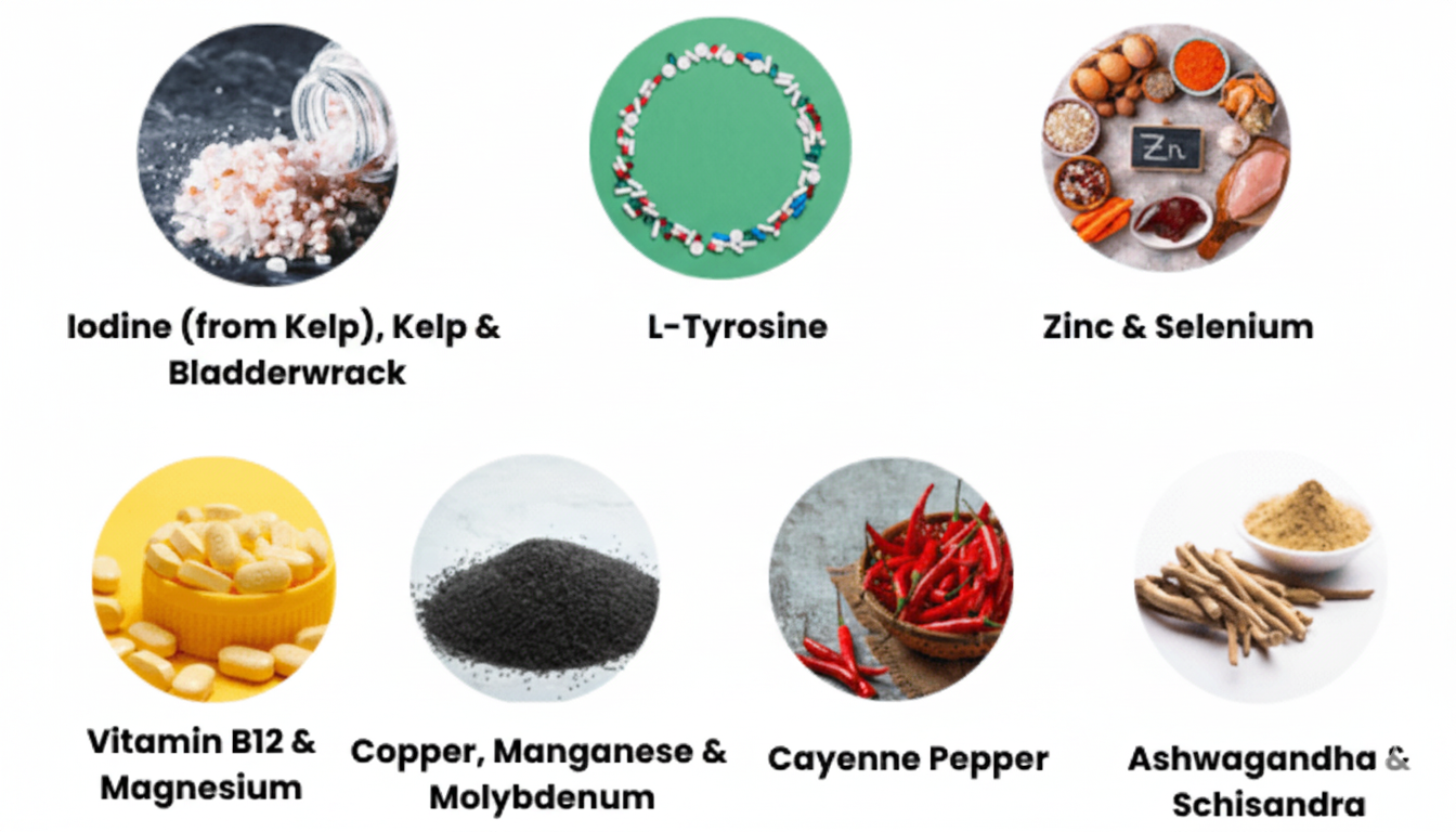 Thyrafemme Balance works by supporting the body’s natural thyroid-regulating mechanisms, delivering the nutrients this gland needs to produce its hormones efficiently. Ingredients like iodine and L-tyrosine are essential for hormone synthesis, while minerals such as selenium and zinc help convert inactive hormones into active forms — a key process for metabolism and energy.